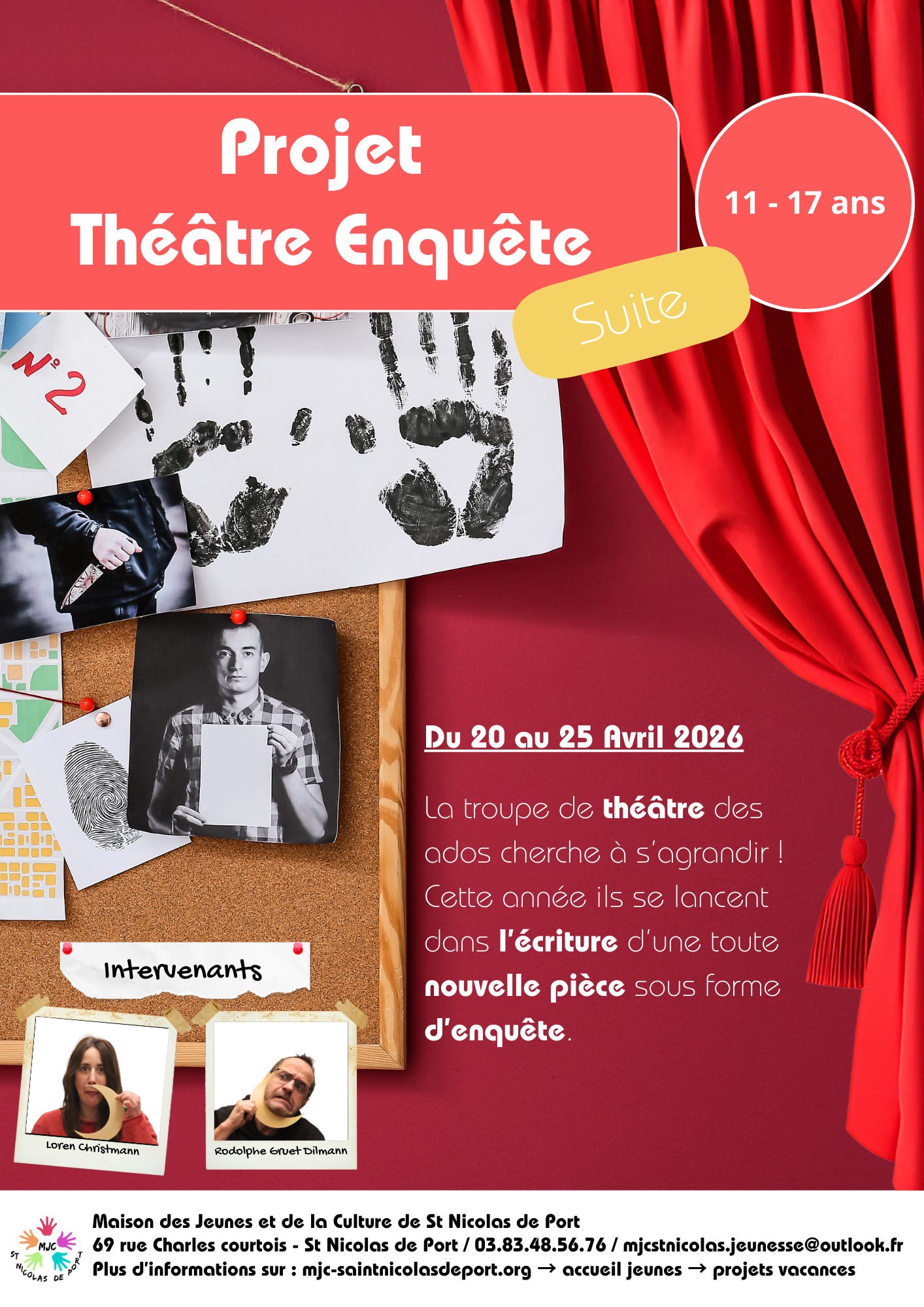 Après le succès de "Retour Dans le Vermois", le théâtre maintient sa place de choix au sein des activités jeunesse. La troupe de théâtre des ados se lancent dans l’écriture d’un nouveau spectacle, sous forme d’enquête policière participative.